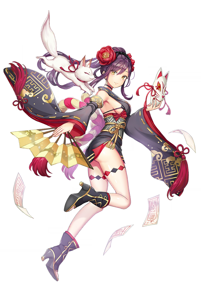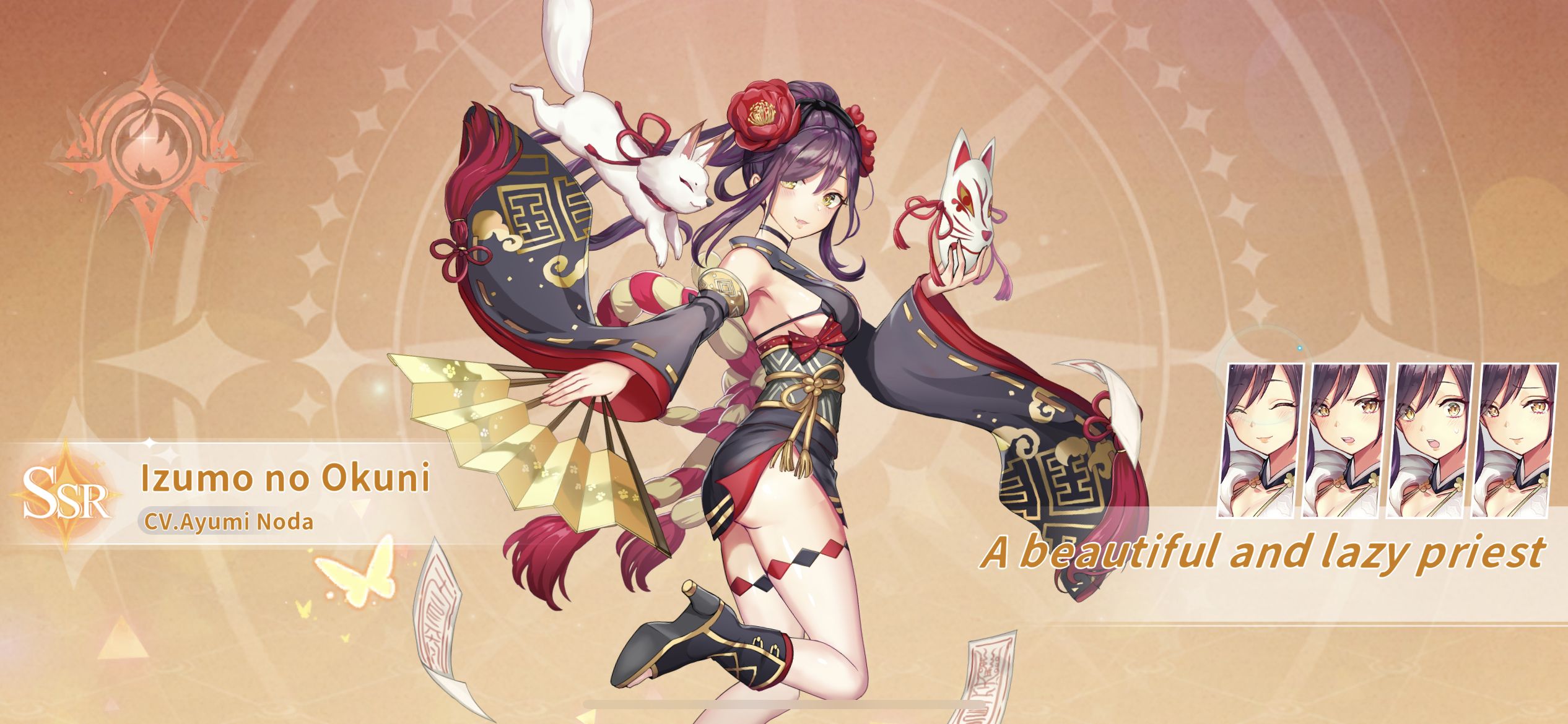 Level 1 - Izumo no Okuni summons fire to deal 96% of her ATK in Magical DMG to a single enemy while recovering an equivalent amount of HP. Any overflow HP is added to her Max HP and the amount added per battle cannot exceed her HP limit.