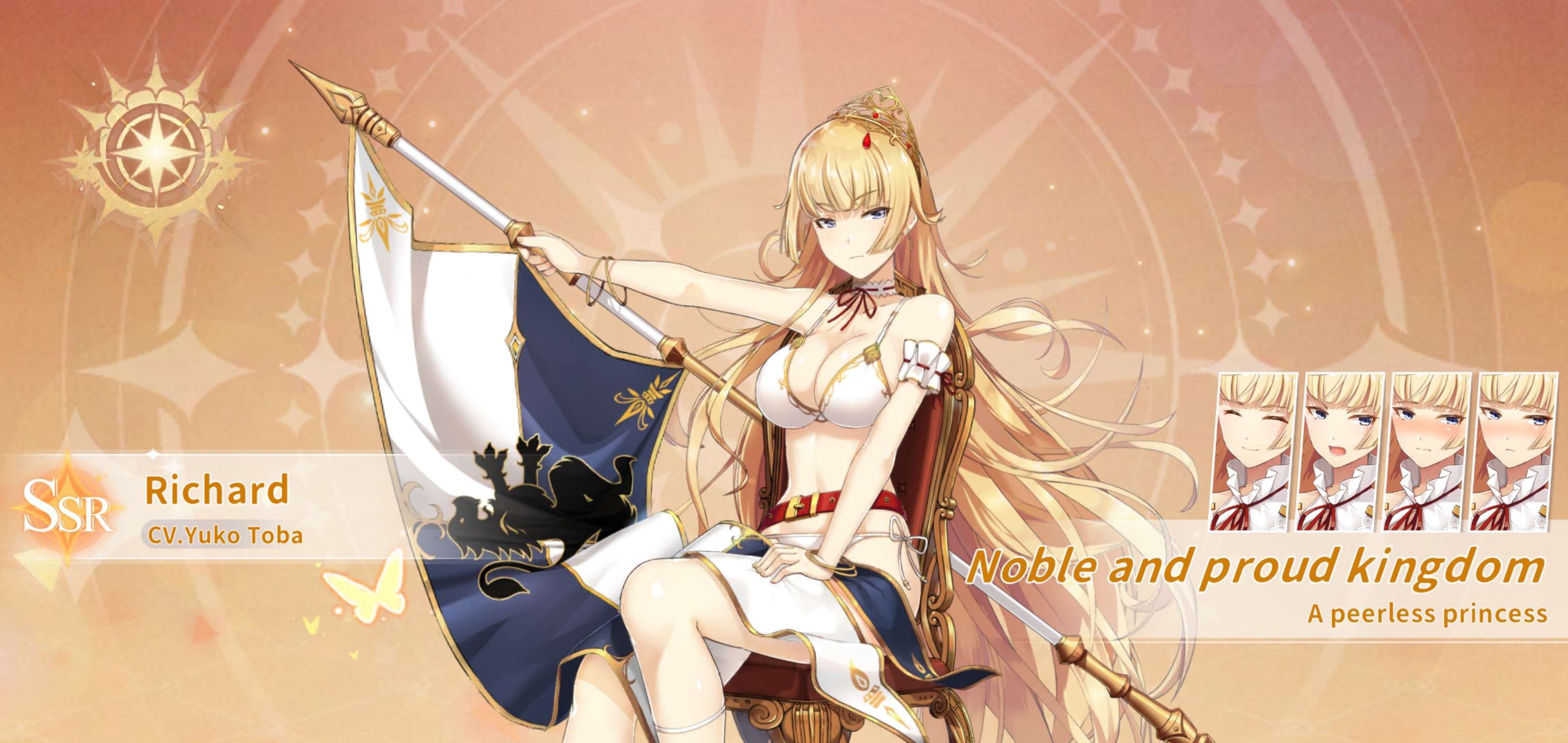 Level 1 - Richard orders her army to charge 3 times at the front column of enemies, each dealing 48% of her ATK in Physical DMG and, encouraging momentum, increasing her team's ATK by 15% for 2 turns.